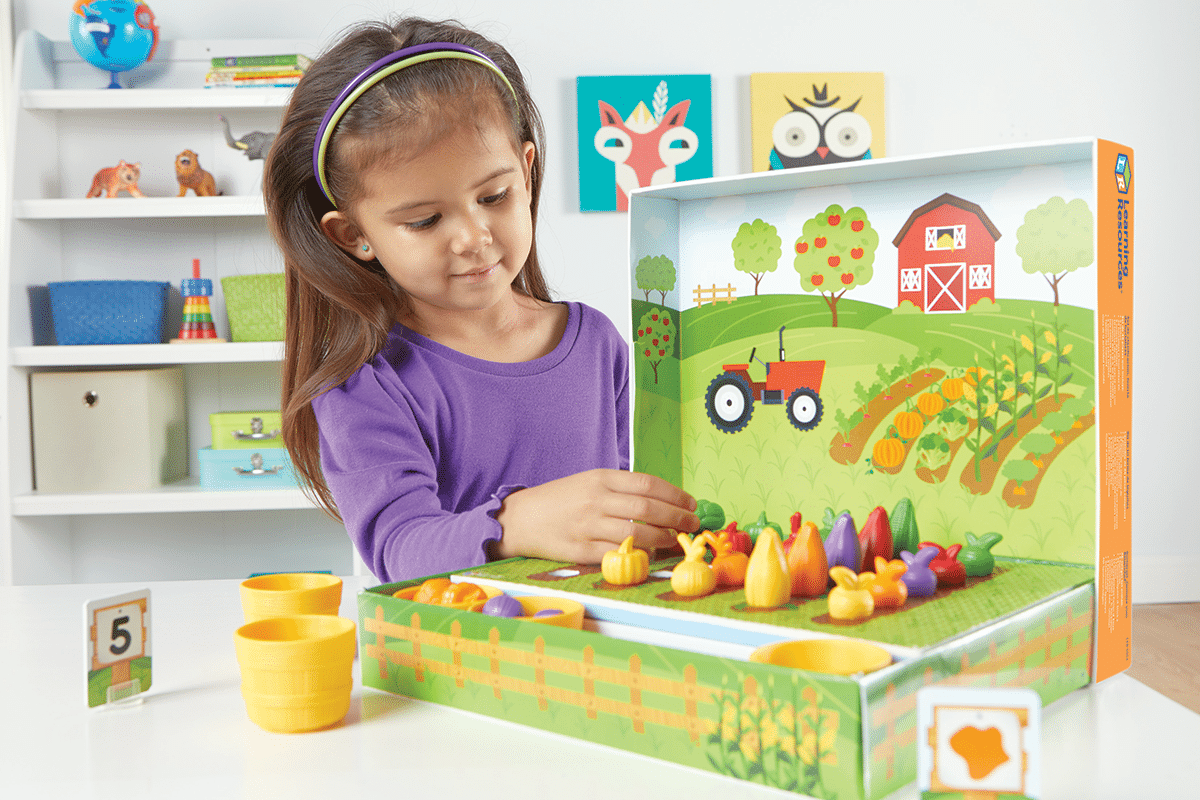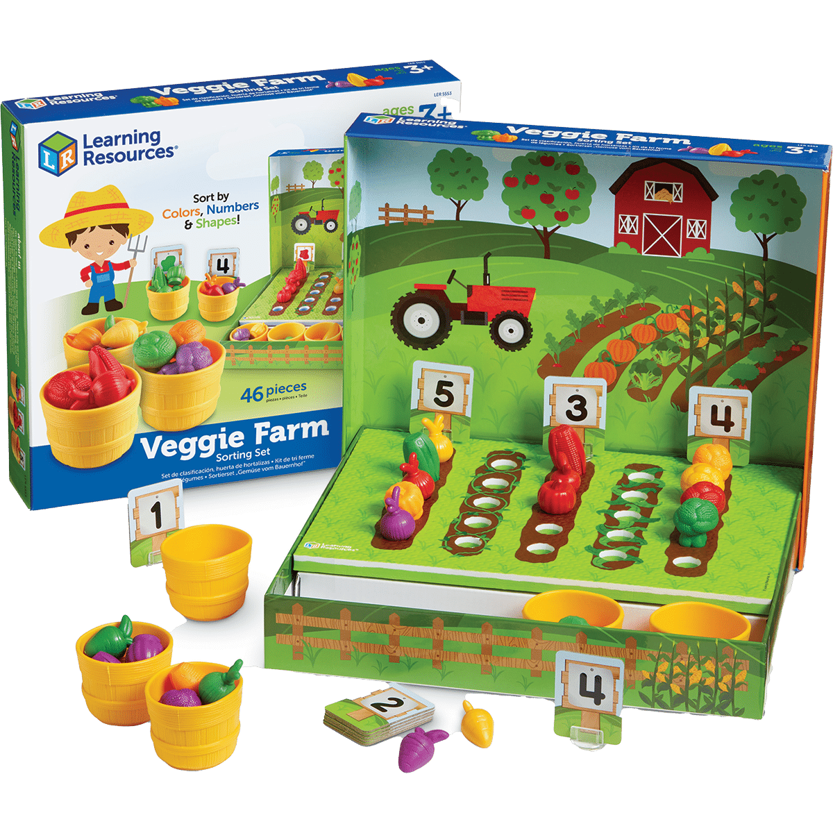 What’s growing in the garden? New learning! This hands-on farm set builds color recognition, matching, sorting, and early counting with chunky, realistic veggie figures in five vibrant colors—think broccoli, corn, onions, pumpkins, and more. Use the bushel baskets and soft foam playmat to sort by color or type, count harvests, and match veggies to the farm-sign pictures. When playtime’s over, everything snaps into a carry case for easy storage or on-the-go fun.