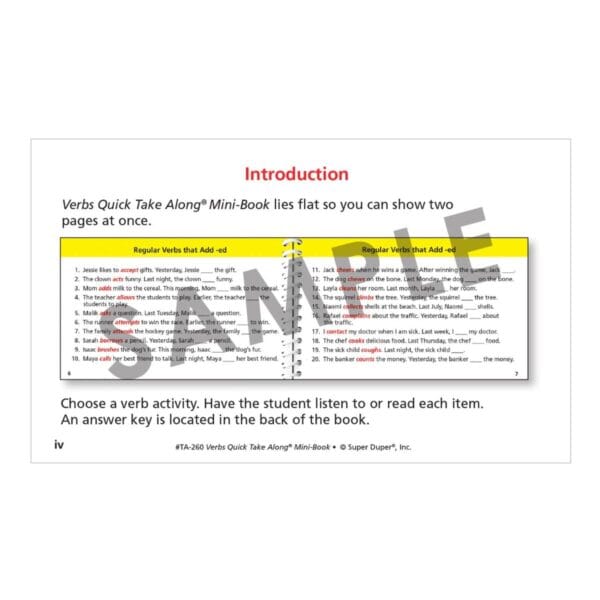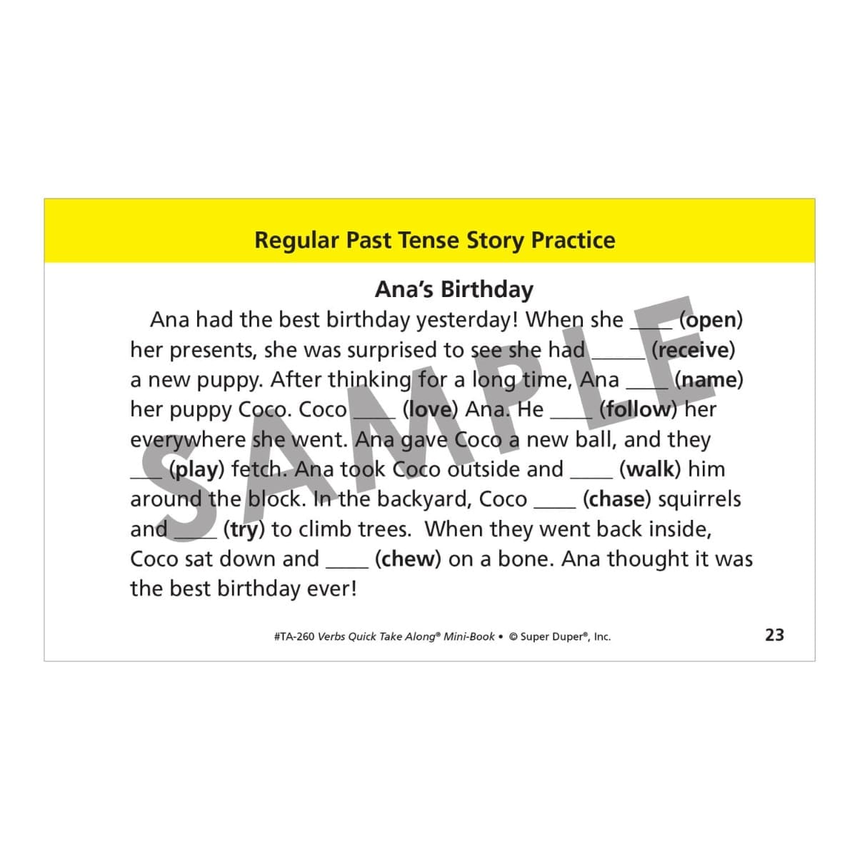 The Verbs Quick Take Along Mini-Book is a pocket-sized, spiral-bound resource designed to help students of all ages master regular and irregular past tense verbs. Perfect for speech-language pathologists, teachers, and parents, this durable mini-book provides targeted practice for improving comprehension and production of verb forms.