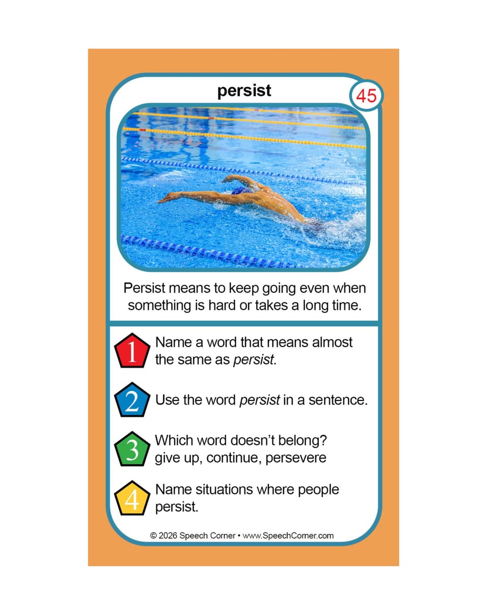 The Vocabulary Vault Double Dice Add-On Deck turns vocabulary acquisition into a mini-adventure. Designed for high engagement and deep processing, each card provides a multi-layered look at a single target word. By using a vivid photo and a “kid-friendly” definition as a starting point, this deck moves beyond simple memorization to help students truly “own” new words through four distinct, interactive pathways.