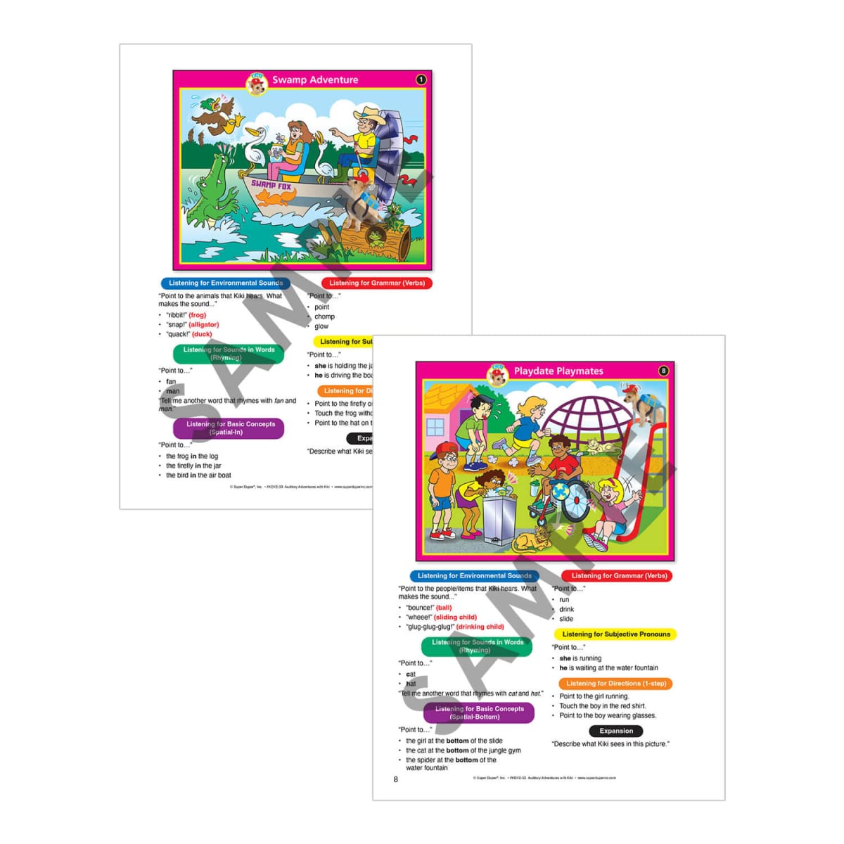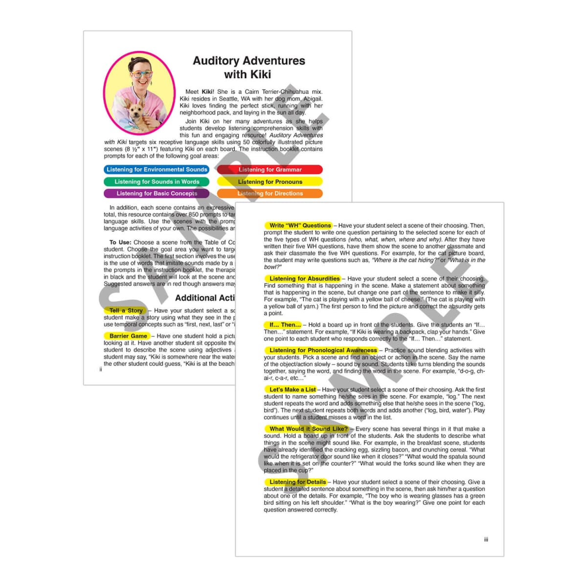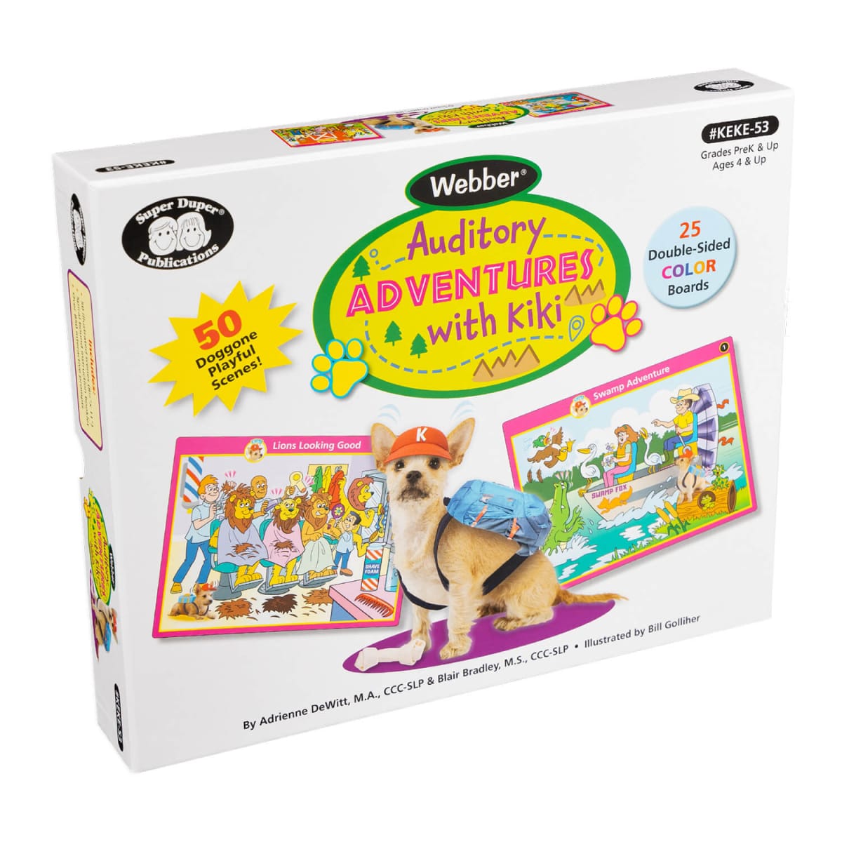 Kiki, a playful Cairn Terrier–Chihuahua mix, loves to go on exciting adventures—and she’s bringing your students along! With 25 double-sided boards (50 picture scenes), children can explore the zoo, farm, library, playground, and more while practicing essential listening and language skills. Just choose a scene, read the prompts from the Instruction Booklet, and ask: “Can you hear what Kiki’s ears hear?”