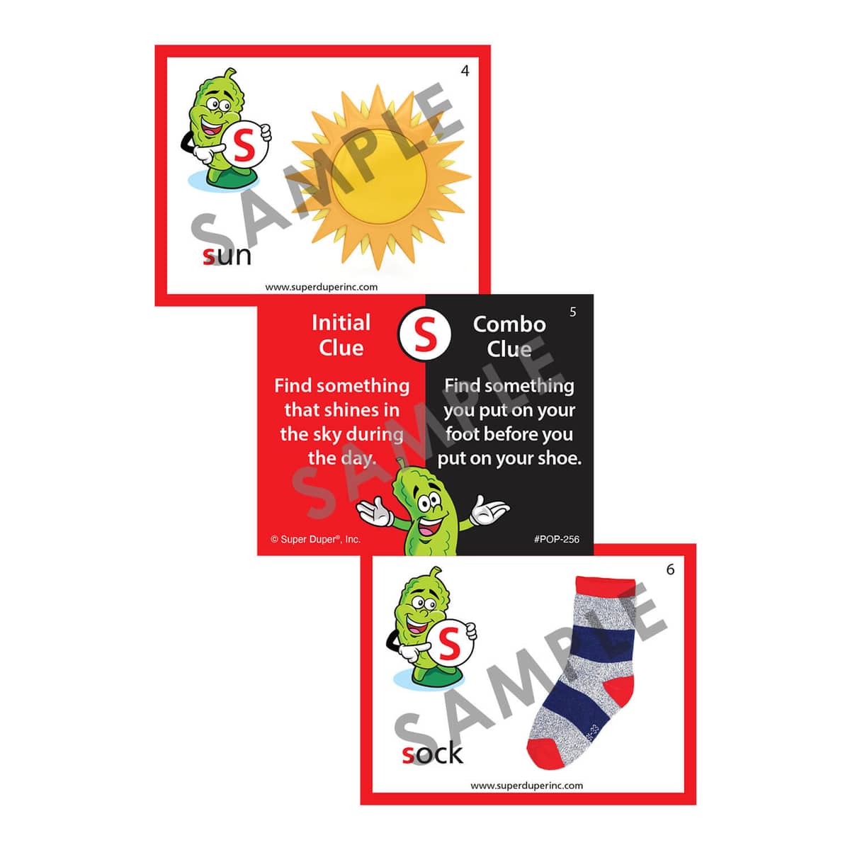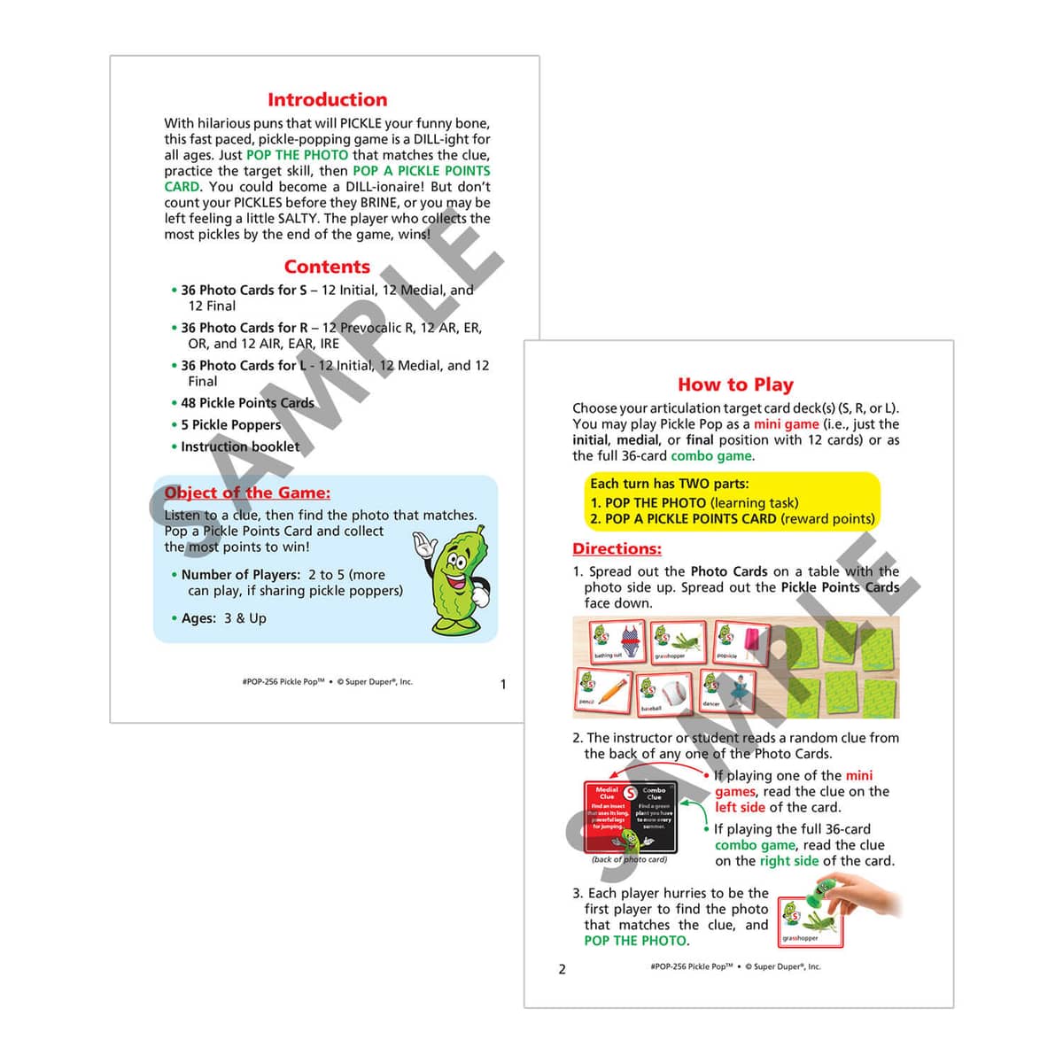 To play Webber Pickle Pop – S, R, L, choose your articulation target card deck(s). You can play a mini game (i.e., just initial, medial, or final position with 12 cards) or a full 36-card combo game. Just read a random clue from the back of any one of the Photo Cards. Then players hurry to be the first player to find the photo that matches the clue. The player who pops the correct photo card first, practices the articulation target on the card then pops a Pickle Points Card. After all of the clues have been read and all of the Photo Cards have been popped, players count the Pickle Points they collected. The player with the most Pickle Points wins!