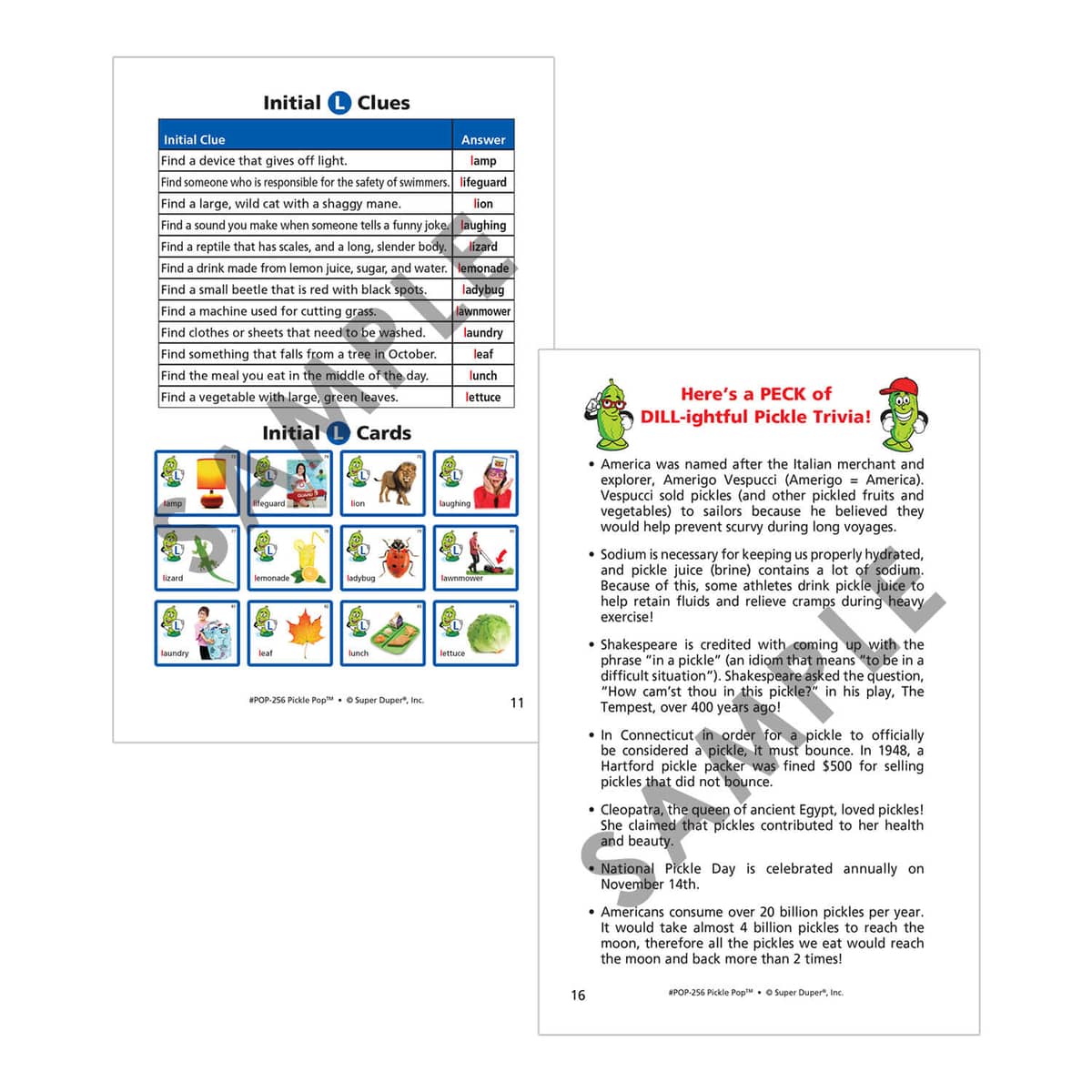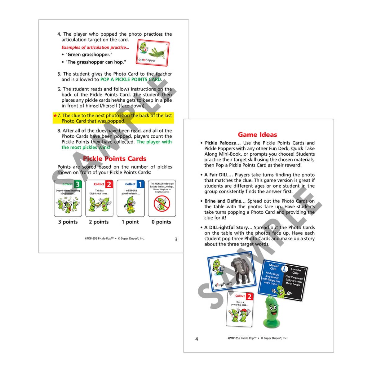With hilarious puns that will PICKLE your funny bone, this fast paced, pickle-popping game is a DILL-ight for all ages. Just POP THE PHOTO that matches the clue, practice the target skill, then POP A PICKLE POINTS CARD. You could become a DILL-ionaire! But don’t count your PICKLES before they BRINE, or you may be left feeling a little SALTY. The player who collects the most pickles by the end of the game, wins!