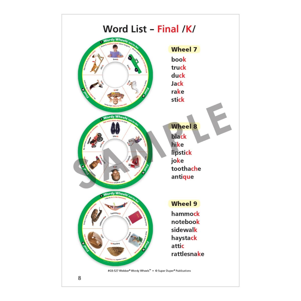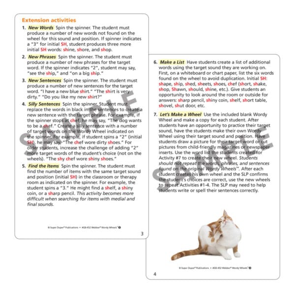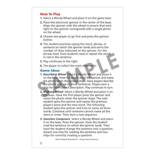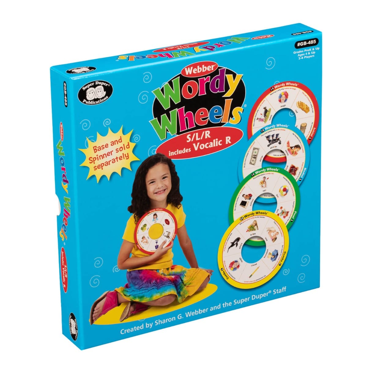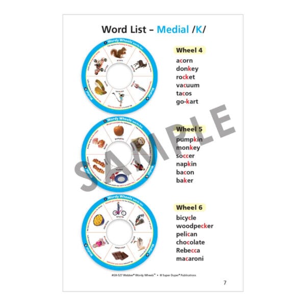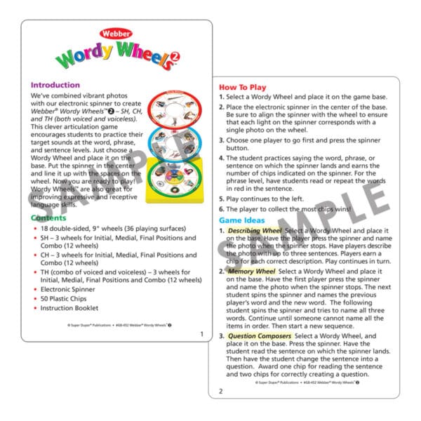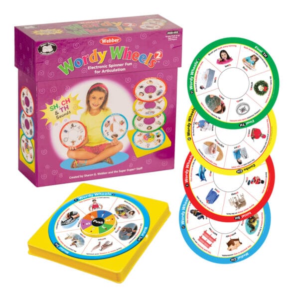 Students of all levels will enjoy taking turns using the electronic spinner and practicing their target sound(s) in words, phrases, and sentences! Just choose a Wordy Wheel and place it on the base. Put the spinner in the center and line it up with the spaces on the wheel. Now you are ready to play! Webber Wordy Wheels Bundle includes three of our popular Wordy Wheels articulation sets (Webber Wordy Wheels – S, L, R, Webber Wordy Wheels Add-On Set – SH, CH, TH, and Webber Wordy Wheels Add-On Set – K, G, T, D). Each set comes in a sturdy box with instructions and game ideas.